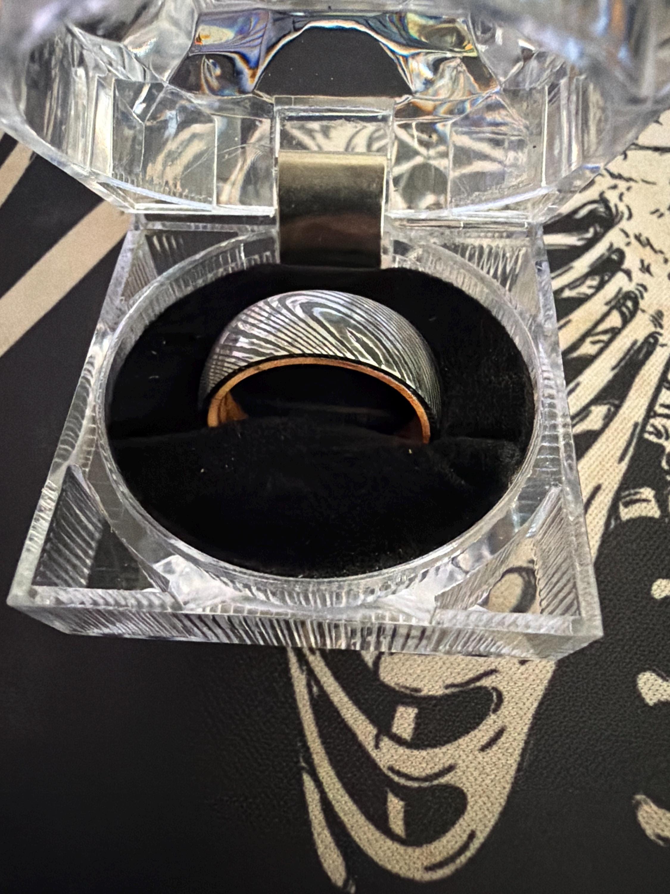 - Genuine Damascus Steel Outer Band (Choice of Silver/Black or Black/Black)