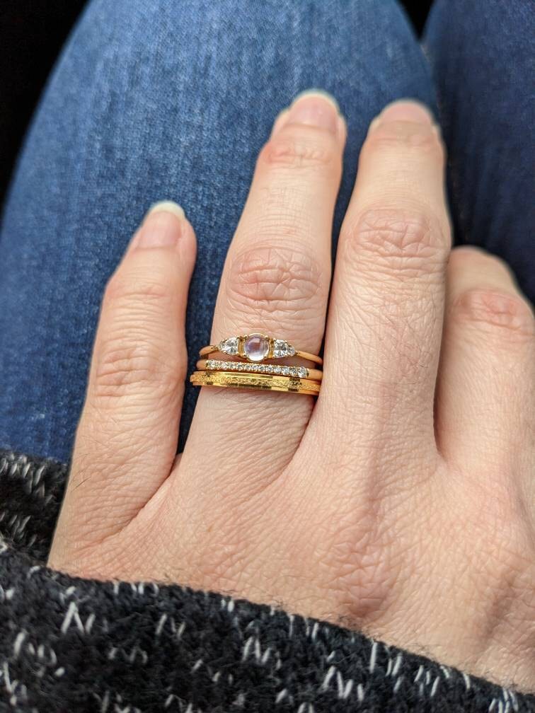 Thank you again for the beautiful ring. This is my second purchase. This time I ordered the gold band as my wedding set was gold (but no longer fits) and this will go beautifully with my other gold jewelry. Excellent craftsmanship and packaged so nicely in a ring box. Highly recommend this shop!