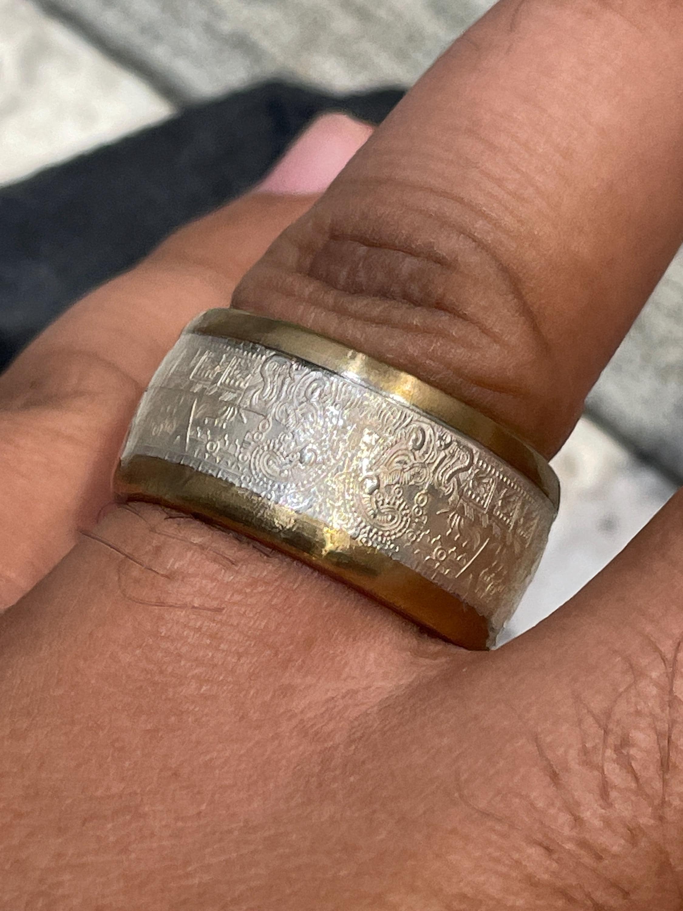 This ring is "Hand-forged" from a rare solid silver 1oz coin in .9999 Pure Silver round bullion coin of the Mayan Tonatiuh Sun Stone calendar (faces outward). After the coin is hand forged into a ring I lathe a double-sided band on both sides and plate in real precious metal (24k Gold shown in the photos and video above with antique patina finish over the silver center of the calendar minting) for an incredible two-tone feature. I also hone out the inside reed for a very comfortable feel compared to others who don't. It's an automatic that "all" of our coin rings get the comfort-fit touch!